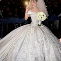 Una falda voluminosa, un corsé ceñido a la silueta y un escote barco envuelto por detales románticos, el atuendo nupcial estaba inspirado en los trajes de la Casa de Habsburgo, además de encontrarse ornamentado por un bordado a mano de perlas, cristales, hilos de plata y pedrería austríaca, llegando a pesar un total de setenta kilos.