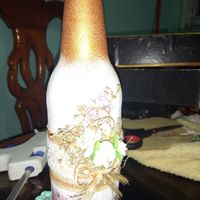 Hoy les quiero compartir parte de lo que serán las invitaciones de boda, son botellas de cristal, decoradas con la técnica decoupage y tela de yute, encaje, flores y un moñito rustico