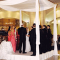 pues se supone el novio y la novia estan como en unas sillas y los dos sujetan el velo de la novia o un trozo de tela y las personas que pasan para tirarlos significan los problemas que pueden tener y...