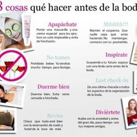 Hace 4627 díasHola! Para aquellas que ya pronto su gran día les dejo estas 8 cosas q deben hacer antes de su boda, para que los tomen en cuenta, aplica tanto para ellas como para ellos . Alma.