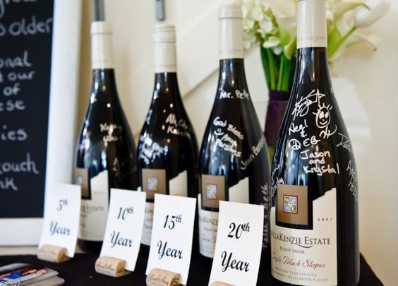 Hola chicas! Encontré esta idea que me encanto Son botellas ¡Pero no cualquier botella! Estas botellas las firmaran tus invitados el día de tu boda Pero ay no acaba! La abrirás en el aniversario que te toque! Me encantaron nenas y las quiero el...