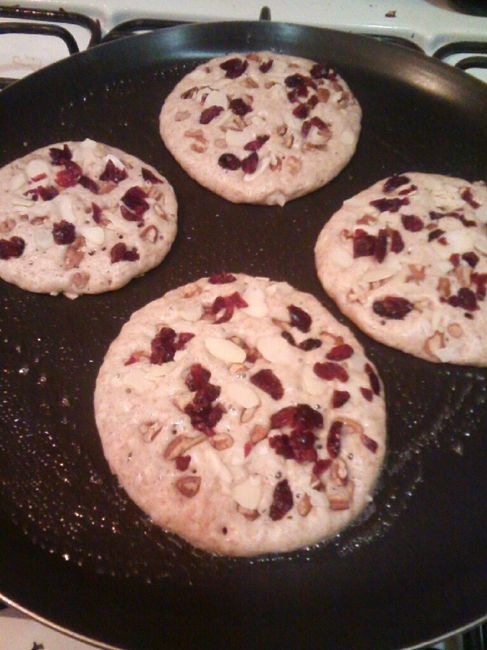 Unis ricos hotcakes de harina integral con arandanos, nuez y almendra, a cenar gustan