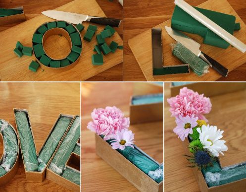 Hola chicas les dejo este diy para las que quieran hacer su letrero love 1. Consigue cajas de cartón o mdf con las letras 2. Esponja verde 3. Coloca las flores de tu agrado!