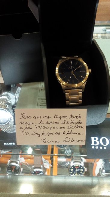 LE PUSE ESA NOTITA QUEIRÁ DENTRO CUANDO LO ABRA LA LEERÁ Hola brides! pues resulta que ya casi me caso!! faltan 38 días y les cuento que cuando mi fm me dió mi anillo me dijo como de bromita : ahora me debes mi reloj heee porque me contaron que si...