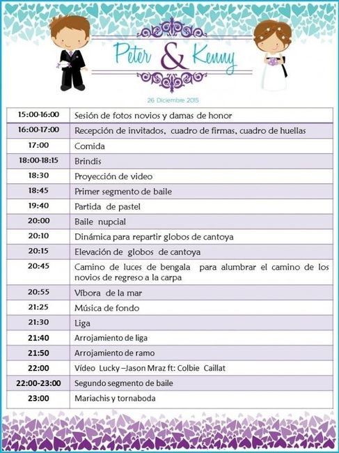Hola hermosasEstoy en una confusión y a tan solo 28 días de la boda, estoy organizando o mejor dicho planeando el horario de todo lo que va ser el evento ya que queremos que sean un poco raoido para disfrutar de la música la fiesta la bebida jajaja...
