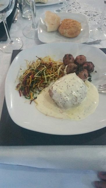Uff ayer fue mi degustacion y ya para el postre ya estaba super llena!! Pero todo muy rico....con ustedes nuestro menu para la boda y nuestro montaje de mesa Entrada ( alternada)Hojaldre relleno de queso de cabraMolote poblano CremaDe alcachofa Plato...