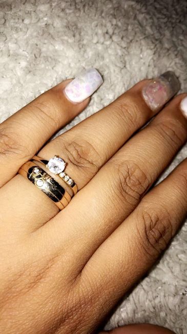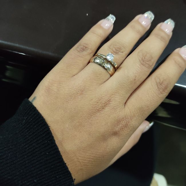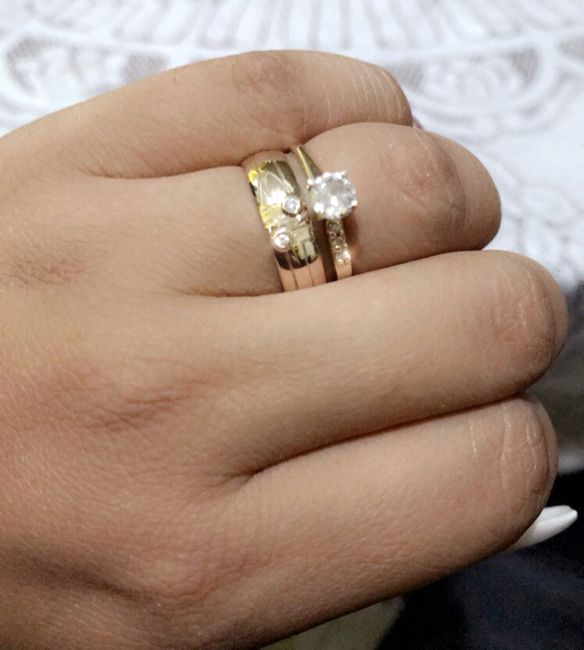 Hola ¿Qué tal el domingo? Ya tengo Por fin mis dos anillos en la mano el de la boda y el de compromiso. Utilizarían los dos anillos? Enséñenme su mano!