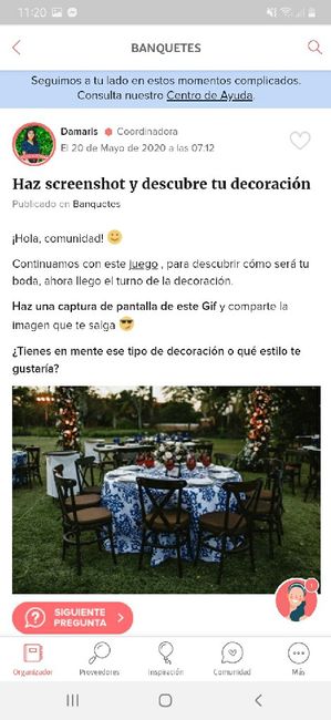 ¡Hola, comunidad! Continuamos con este juego , para descubrir cómo será tu boda, ahora llego el turno de la decoración. Haz una captura de pantalla de este Gif y comparte la imagen que te salga ¿Tienes en mente ese tipo de decoración o qué...