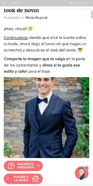 ¡Hola, chic@! Continuamos viendo qué dice la suerte sobre tu boda, ahora llego el turno de que hagas un screechot y descubras el look del novio. Comparte la imagen que te salga en la parte de los comentarios y dinos si te gusta ese estilo y...