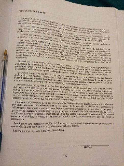 Muy queridos papás: Mi pareja y yo les queremos enviar estas letras con ocasión de nuestro próximo matrimonio, ya que aunque hemos platicado ya bastante de esto, sin embargo, queremos comentarles varias cosas y dejárselas por escrito para que las...