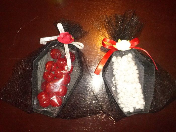 bueno he aqui la iidea loca de mi novio con los recuerditos, un pequeño ataud que llevará dulces en forma de corazón sabor menta o canela, que opinan? me gusta la idea, es mas que fuera de lo común, pero mi madre dice que es mal augurio, que dicen? ...
