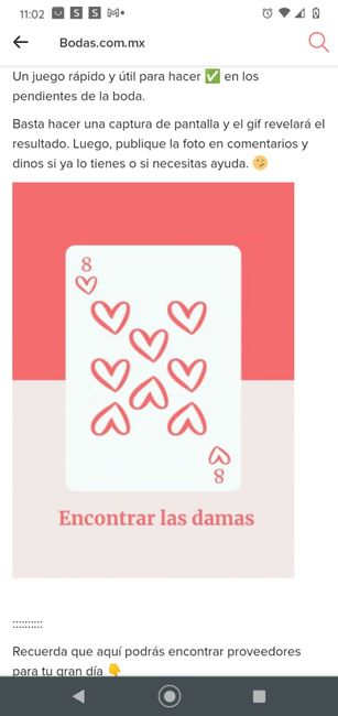 ¡Hola, parejas! ¿Cómo están? Un juego rápido y útil para hacer ✅ en los pendientes de la boda. Basta hacer una captura de pantalla y el gif revelará el resultado. Luego, publique la foto en comentarios y dinos si ya lo tienes o si necesitas...
