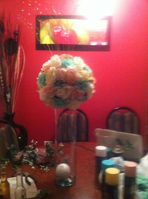 Hace 4728 díasEste es el otro centro de mesa q pretendo poner, que les parecen los colores? Aún no está terminado le faltan más detalles! Espero me den su punto de vista, también quisiera saber que material puedo usar para que la BOLÁ quede más grande, yo le puse...
