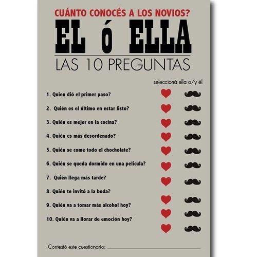 Siguiendo con la dimanica Test para conocernos mejor: Él o tú ¿Quien de los 2 tiene o tuvo más invitados? Él Tú Siguiente -----> Él o tú: ¿quien es más organizado?