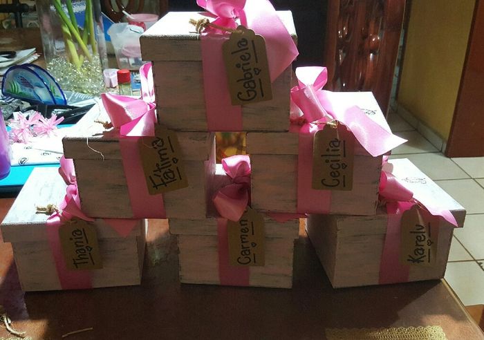 Despues de llevarme en preparativos las cajitas para invitacion a las bridesmaid...aqui esta el resultado...me gustaron porque las hoce con mi manos y con apoyo de mi hnito. Mi novio me apoya porque esta trabajando fuera.