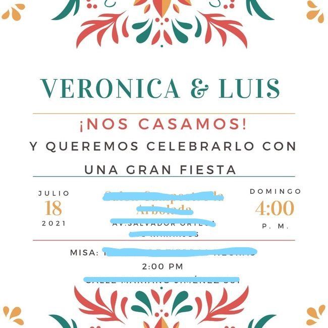 Hola mi boda ya es pronto es por la iglesia y todo pero la organizamos súper rápido en 3 meses y contando jejejeje pero cuando mande hacer la invitación no le puse nombres de mis papás ni de padrinos...